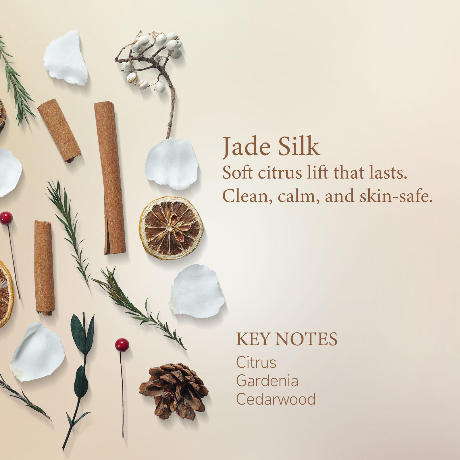 Jade Silk is made for in-between moments: quiet mornings, slow commutes, thoughtful starts. The fragrance opens with fresh citrus, bergamot, and a hint of jasmine—barely sweet, always clean. As it settles, gardenia and orange blossom bloom like skin-warm petals, grounded by orris, vetiver, and cedar.